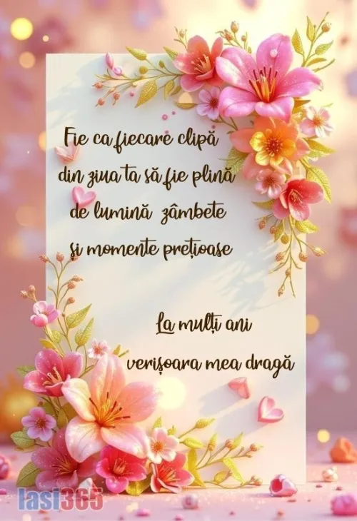 Fie ca fiecare clipă din ziua ta să fie plină de lumină, zâmbete și momente prețioase. La mulți ani, verișoara mea dragă! Îți doresc tot ce e mai frumos în viață!